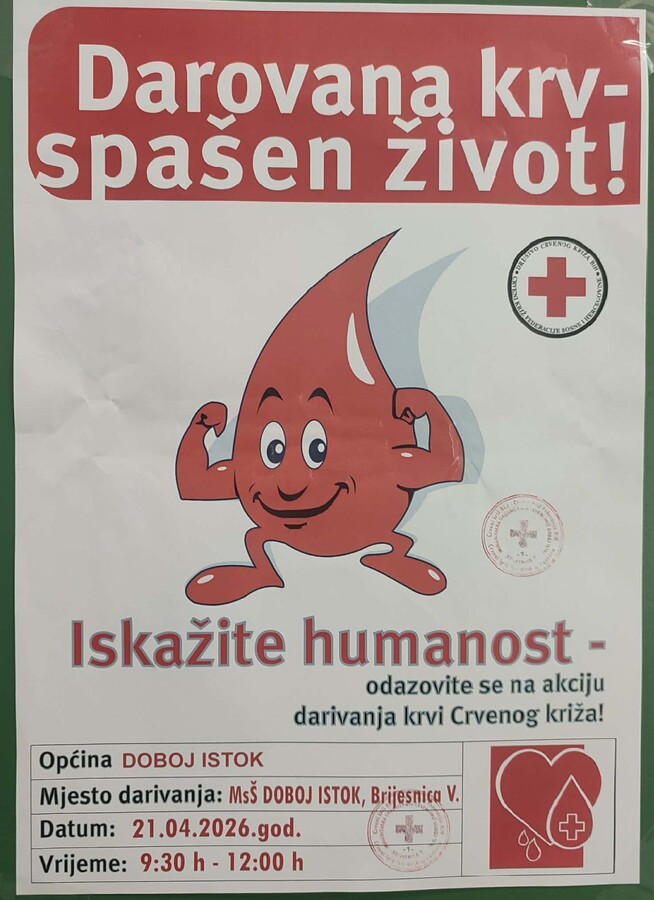 U utorak 21.04.2026 će se u prostorijama MSŠ DOBOJ ISTOK, održati dobrovoljna akcija darivanja krvi.