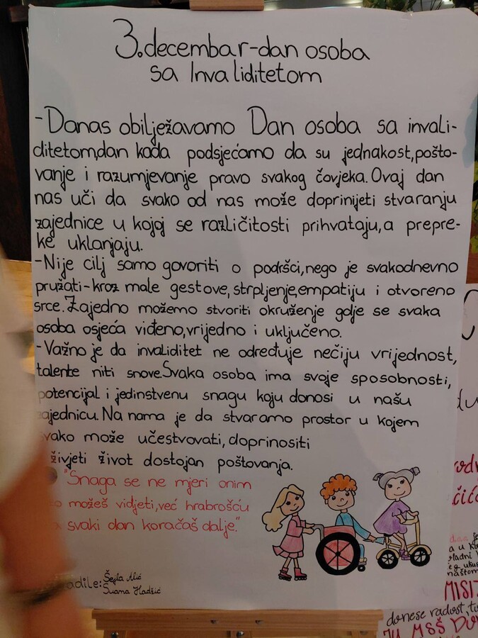 U našoj školi je, povodom Dana osoba s invaliditetom, organizovan niz aktivnosti s ciljem podizanja svijesti o važnosti inkluzije, empatije i razumijevanja prema osobama s teškoćama u razvoju. Centralni dio obilježavanja činile su radionice i prezentacije održane u odjeljenjima I-5 i I-1, koje je vodila defektolog Nejra Hadžić.