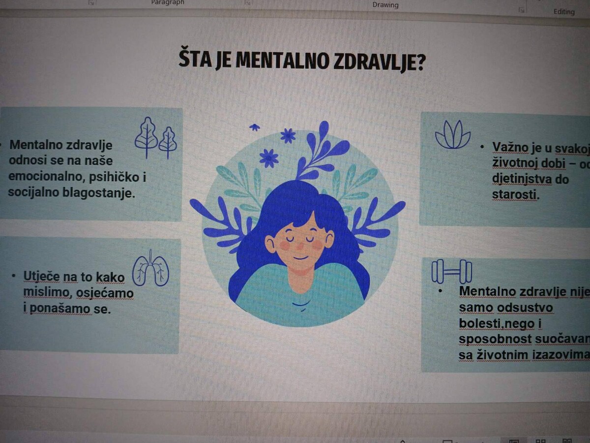 U okviru obilježavanja Svjetskog dana mentalnog zdravlja koji se svake godine obilježava 10. Oktobra, u našoj školi su održane edukativne radionice i prezentacije na temu "Mentalno zdravlje".Aktivnosti su realizovane u razredima I1, I5, I6 i I4 s ciljem jačanja svijesti učenika o važnosti očuvanja mentalnog zdravlja i razvijanja pozitivnih stavova prema sebi i drugima.Učenici su aktivno učestvovali u razgovoru, dijelili svoja iskustva i mišljenja, te učili o važnosti međusobnog poštovanja, empatije i podrške. Kroz primjere iz svakodnevnog života razgovaralo se kako prepoznati znakove stresa i ohrabriti sebe ili prijatelja da potraži pomoć.Prezentacije je pripremila Def. Nejra Hadžić u suradnji sa učenicama Suanom Hadžić i Šejlom Alić iz I5, kao i sa razrednicima i stručnom službom škole. Aktivnosti su protekle u pozitivnoj i podsticajnoj atmosferi i spremnosti da uče o ovoj važnoj temi.Period realizacije od 10.10.- 21.10.2025. godine.